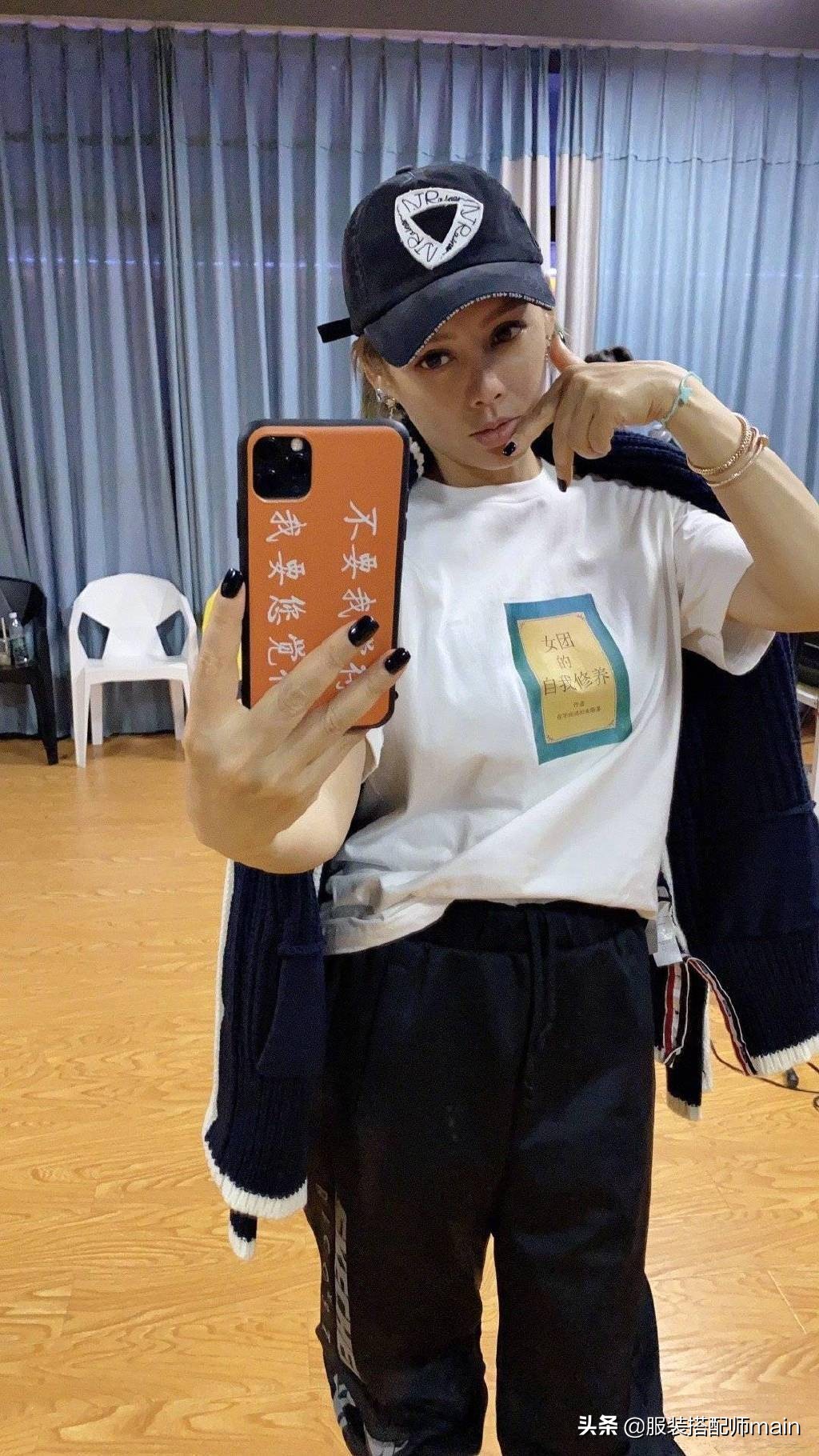 虽然可爱风宁静驾驭得也相当不错,但是还是酷劲儿十足的风格更加适合我们霸气的静姐,白色团服和运动黑裤都能穿出来一种想让人喊“大姐头”的霸气,球帽加黑指甲的造型街头感十足。层层叠叠的手镯给硬朗的姐姐增添了一丝柔美的女人味,真是刚柔相济的奇妙组合~